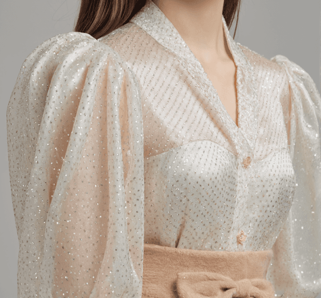 Soft shimmer meets timeless allure in the Evara Gilded Twilight Sheer Blouse. Designed with delicate sparkle and sculpted sheer sleeves, this piece radiates elegance that’s both modern and effortlessly captivating.