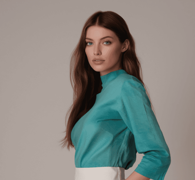 Graceful, modern, and effortlessly refined, the Evara Celeste Silk Blouse is a celebration of understated luxury. Crafted from a fine silk-blend fabric, it offers a fluid drape and a soft, lustrous finish that feels weightless against the skin. The minimalist mock neckline and three-quarter sleeves strike a balance between structure and ease, making it an ideal piece for both professional settings and evening sophistication. The radiant teal hue brings a fresh pop of color while maintaining timeless appeal. Style it with high-waisted white pants or tailored neutrals for a look that exudes quiet confidence and grace.